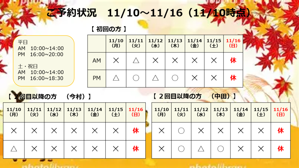 曜日によって各セラピスト不在日がございますので、ぜひご確認ください。
