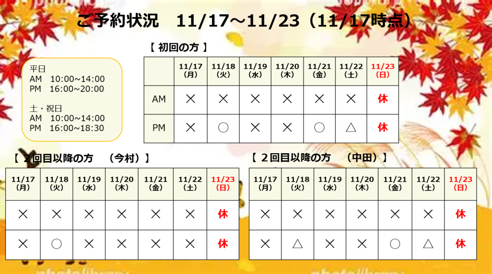 今週の予約状況について(11/17~11/23) 今週の予約状況についてお知らせいたします(^^)/ 曜日によって各セラピスト不在日がございますので、ぜひご確認ください。 ご予約が大変埋まりやすくなっております。ご予約をご希望の方はお早めのお問い合わせをおすすめいたします。 ※日曜日は、定休日とさせていただきます。 松戸で整体をお探しならKINMAQ(キンマク)整体院 松戸常盤平院へ! 皆様のご予約・お問い合わせをお待ちしております。
