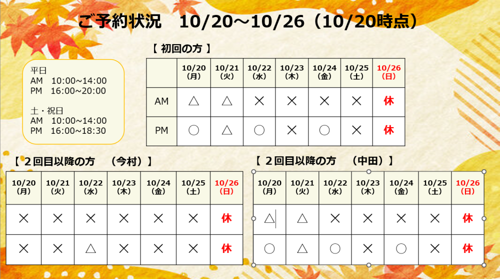 ご予約が埋まりやすくなっておりますので、ご予約をご希望の方はお早めのお問い合わせをおすすめいたします。