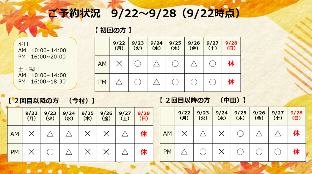 今週の予約状況(9/22~9/28) 今週の予約状況をお知らせいたします(^^)/ 曜日によって各セラピスト不在日がございますので、 ご予約を取る際はお早めにお問い合わせください。 ※日曜日は定休日です 松戸で整体をお探しならKINMAQ(キンマク)整体院 松戸常盤平院へ! 皆様のご予約・お問い合わせをお待ちしております。