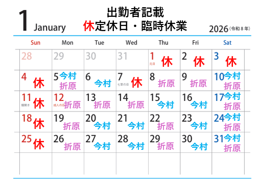 1月営業カレンダー 1月営業カレンダー 1月の営業カレンダーです。 予約が大変埋まりやすくなっておりますので、お早めにご予約下さい。 また、土曜日は予約の空き枠が少ない状況です。 平日のご予約も合わせてご検討ください。 松戸で整体をお探しならKINMAQ松戸常盤平院へ!