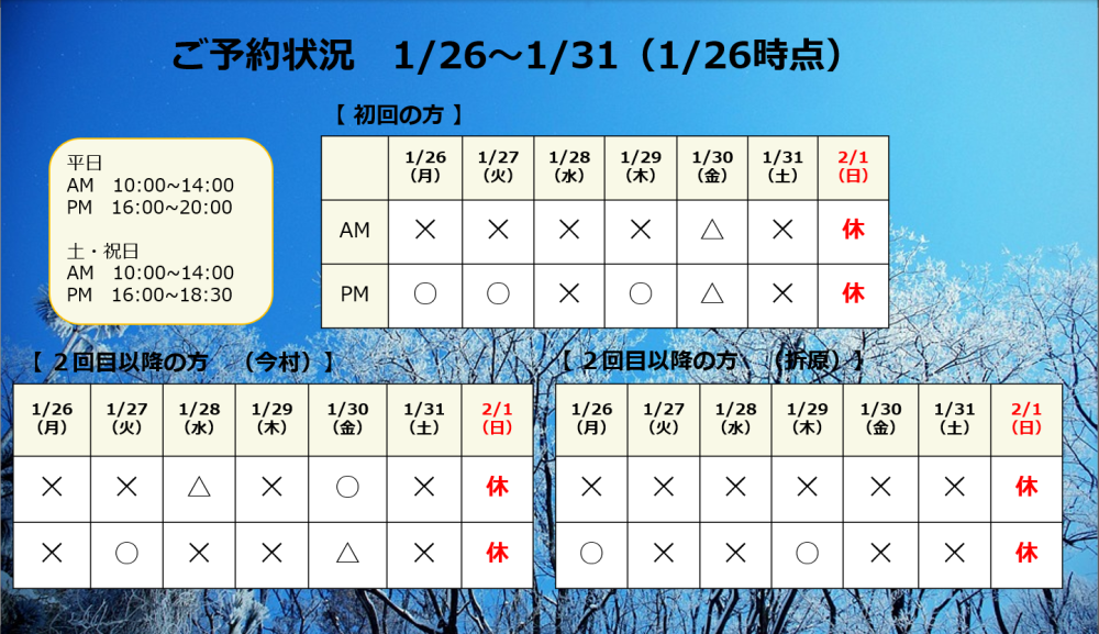 今週は、比較的予約が埋まっておりますので、ご予約をご希望のかたは、お早めにご連絡ください。