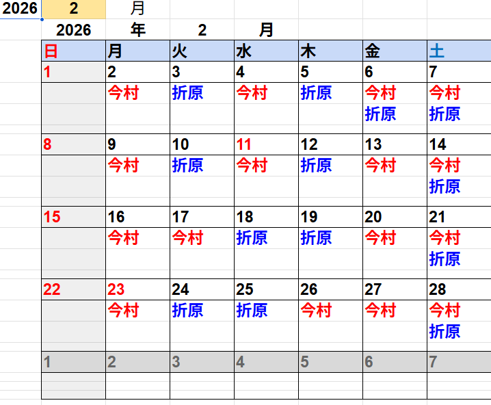 2月の営業カレンダーです。